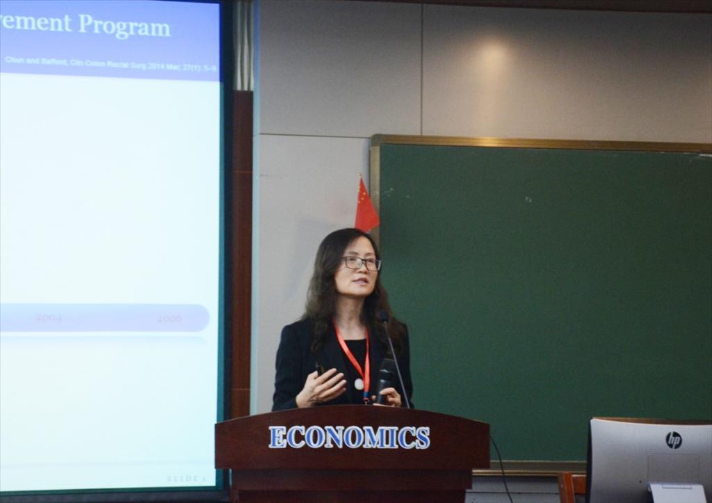 主旨演讲分为上午场和下午场,上午场主旨演讲由方匡南教授主持。第一位主旨演讲嘉宾为美国耶鲁大学公共卫生学院教授、医学院外科预后研究及流行病学部主任张亚玮,她从美国的NSQIP项目的产生以及发展过程出发,结合实际案例和具体数字,强调了医疗质量评价指标和评价系统、专业人员的合作参与的重要性以及对于临床医疗水平提高的关键作用,勾勒出未来发展的新思路,对于中国健康医疗数据平台的建立提出了非常具有前瞻性的建议。