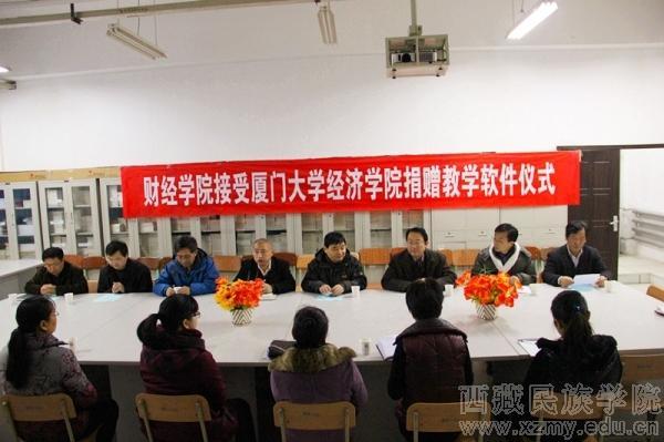 2012年12月18日上午8:30,我院对西藏民族学院财经学院教学软件捐赠仪式在民院4107实验室隆重举行。民院对外合作交流处处长张宏伟、教务处副处长陈新(我校援藏干部)、教务处实践实验科科长张兆基、财经学院党总支书记张献岭、院长毛阳海、副书记李建、副院长刘龙政(我校援藏干部)及财经学院各办负责人、部分教师、厦门大学经济学院教学实验中心工程师袁加军参加了捐赠仪式。仪式由副院长刘龙政主持。