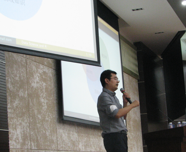 第一场报告由李舰主讲,李舰先生的分享内容环环相扣,从分析数据科学与统计学、机器学习、计算机科学、数据挖掘等学科之间的区别和联系,进而对数据科学提出严谨定义,再到讨论数据科学与R语言的关联,让我们逐步了解了数据科学家这份“最性感的职业”。然后以新药开发为例,通过药动力学、药效学的实际例子,介绍了R的应用。报告最后,李舰先生也提出了成为数据科学家需具备的一些技能和知识,鼓励同学们学好相关技能,从事数据科学这门新兴学科。